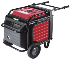 EU6500is Honda Generator Single cylinder, overhead valve 389cc engine 120/240V 6500W max 5500W rated Recoil and Electric Start 4.5 gal fuel tank 4.7 hrs @ rated load 14 hrs @ 1/4 load 60dB @ rated load 253 lbs